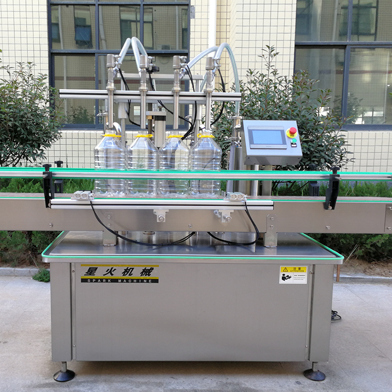 智能液體灌裝機(jī)主要由儲(chǔ)藏料斗、輸送管道、灌裝頭、液位控制器、輸送帶、防滴漏裝置等設(shè)備組成。食用油自動(dòng)化灌裝機(jī)的整個(gè)工作過程全部處于智能操作條件下完成,它主要由PLC控制器配合彩色人機(jī)電腦顯示屏,正式工作前,工作人員應(yīng)當(dāng)提前將液體備至在儲(chǔ)料斗內(nèi),料斗中的液位高度控制著設(shè)備的灌裝速度和液體水平,所以在進(jìn)入灌裝工作前,需要提前將灌裝規(guī)格設(shè)置在顯示屏幕當(dāng)中,啟動(dòng)機(jī)器后,液體將通過輸送管道被傳輸至灌裝頭,灌裝頭將會(huì)按照預(yù)設(shè)的灌裝量將液體精準(zhǔn)的充填至容器當(dāng)中,灌裝與預(yù)設(shè)規(guī)格一致的容量后,智能液體灌裝機(jī)會(huì)帶動(dòng)產(chǎn)品進(jìn)入下一個(gè)生產(chǎn)工序。